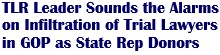 Lawsuit reform group has ample cause for fast-growing angst as analysis shows 36 House and Senate Republicans with funds from plaintiffs bar pair, PAC and firm or combo including dozen freshmen with running count near $1.3 million and rising with primaries under way. more